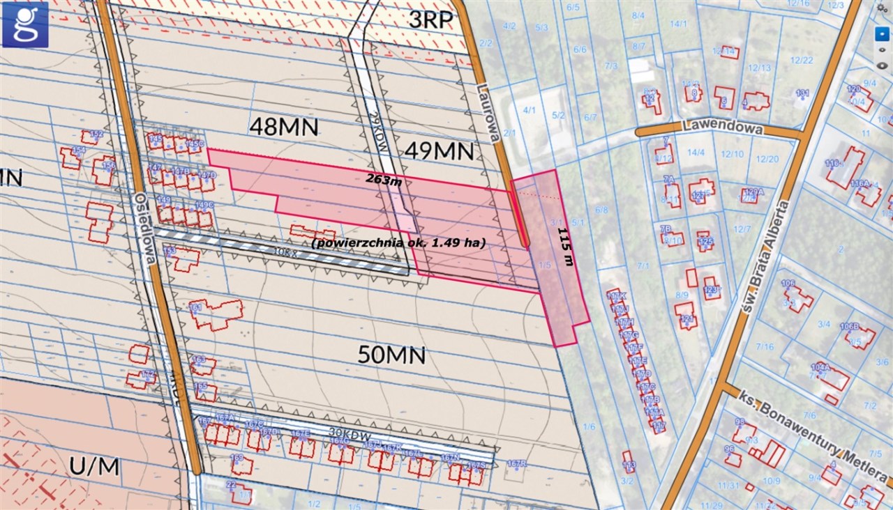 Działki budowlane o powierzchni ok. 14900 m2 zlokalizowane w okolicach ul. Św. Brata Alberta na Wierzchowisku (gmina Mykanów) - 5 km od centrum Częstochowy.