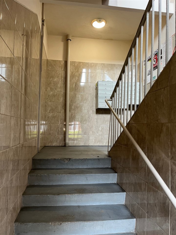 Blok czteropiętrowy z odnowioną elewacją, docieplony. Klatka schodowa z domofonem.