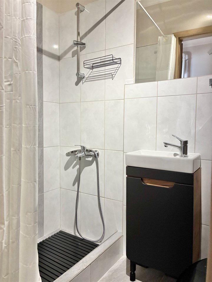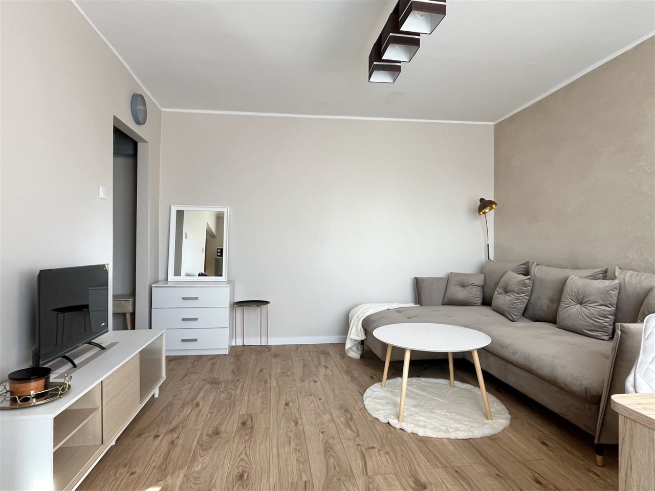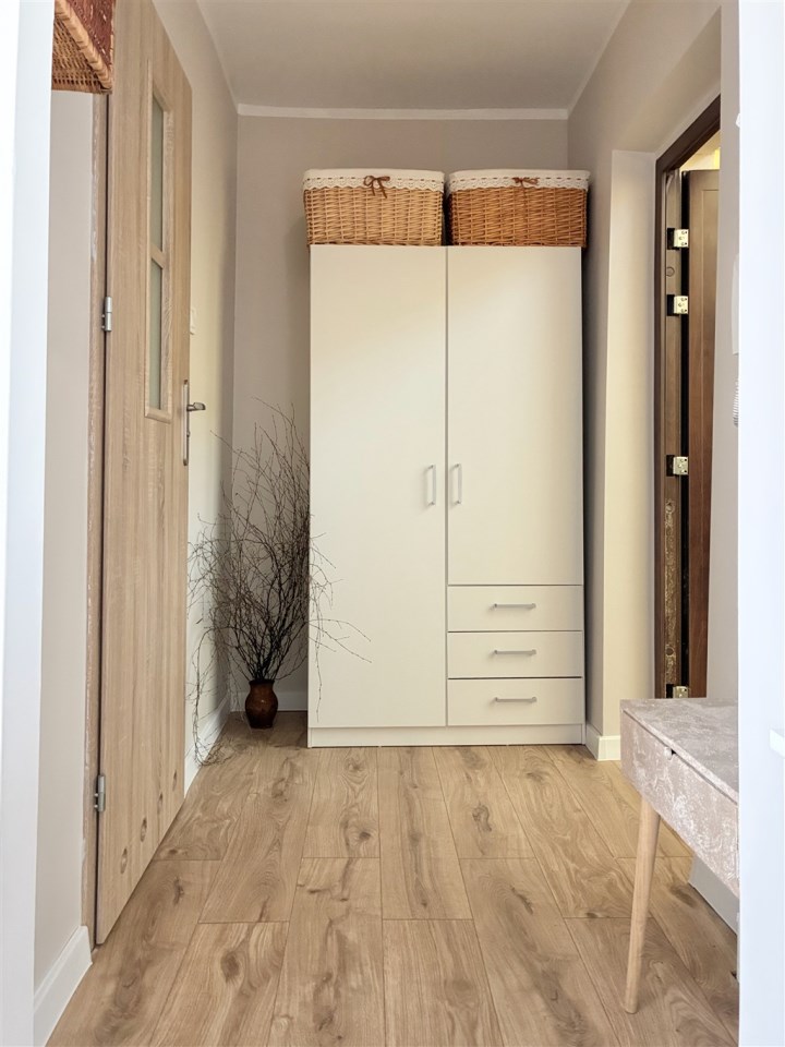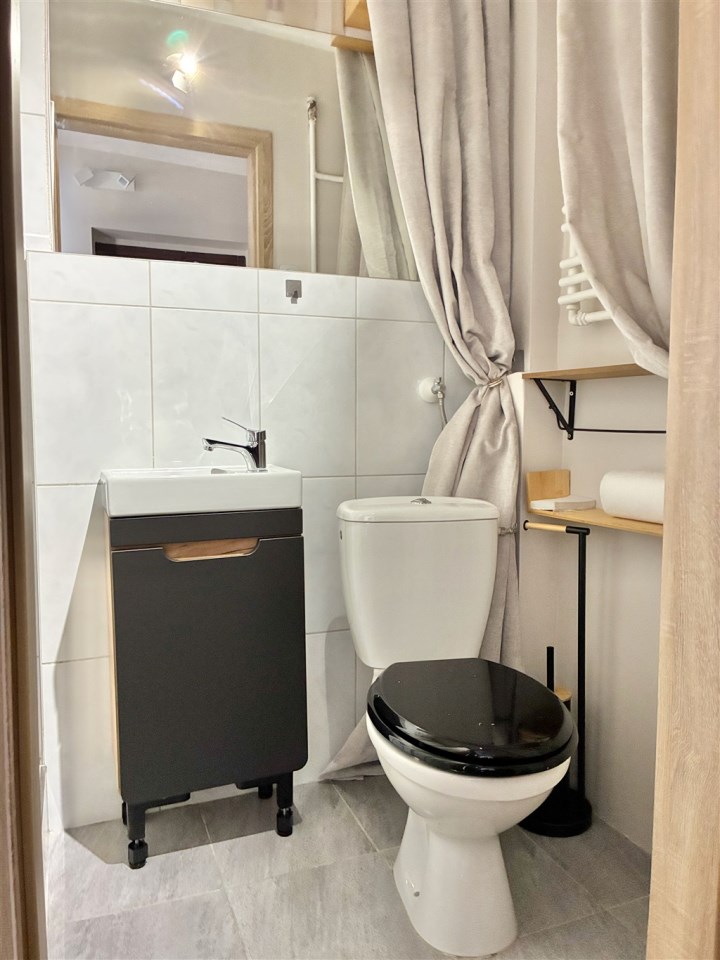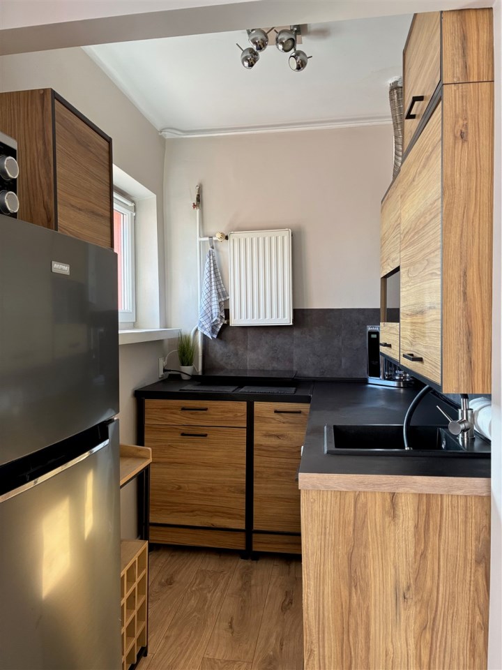 Wyposażenie: meble kuchenne, kuchenka indukcyjna, lodówka, pralka, narożnik rozkładany, biurko, szafa, komoda, stolik.