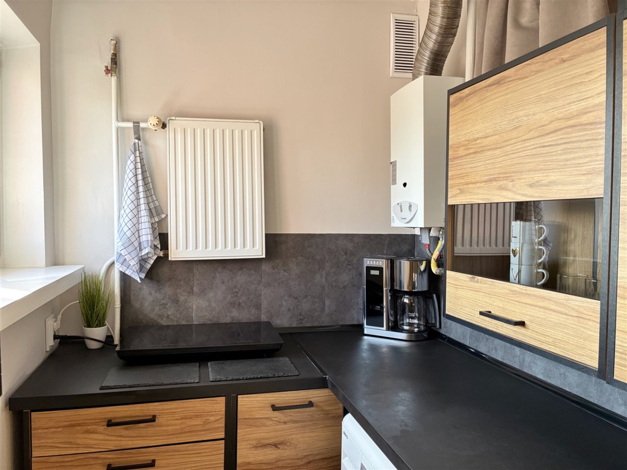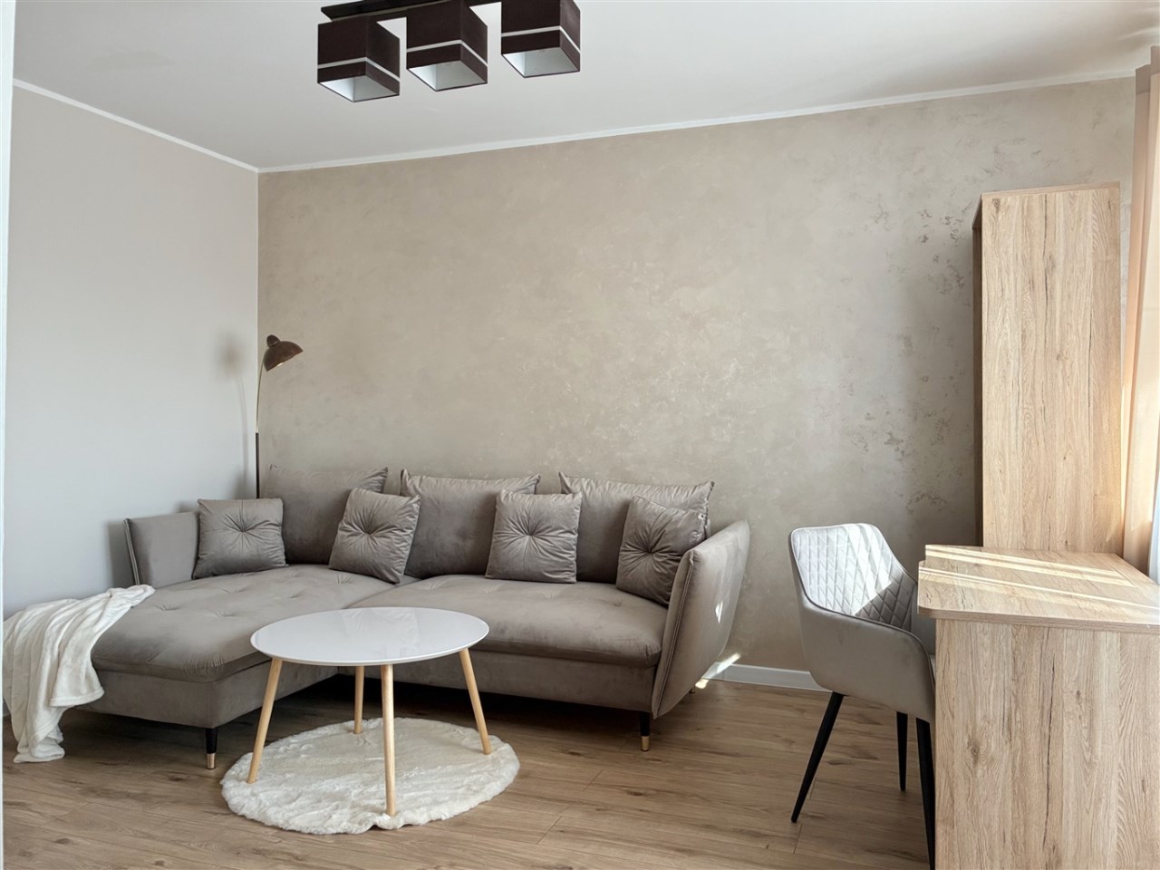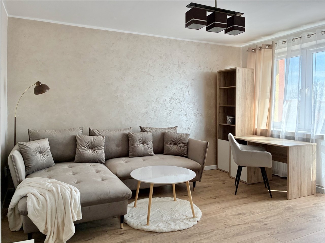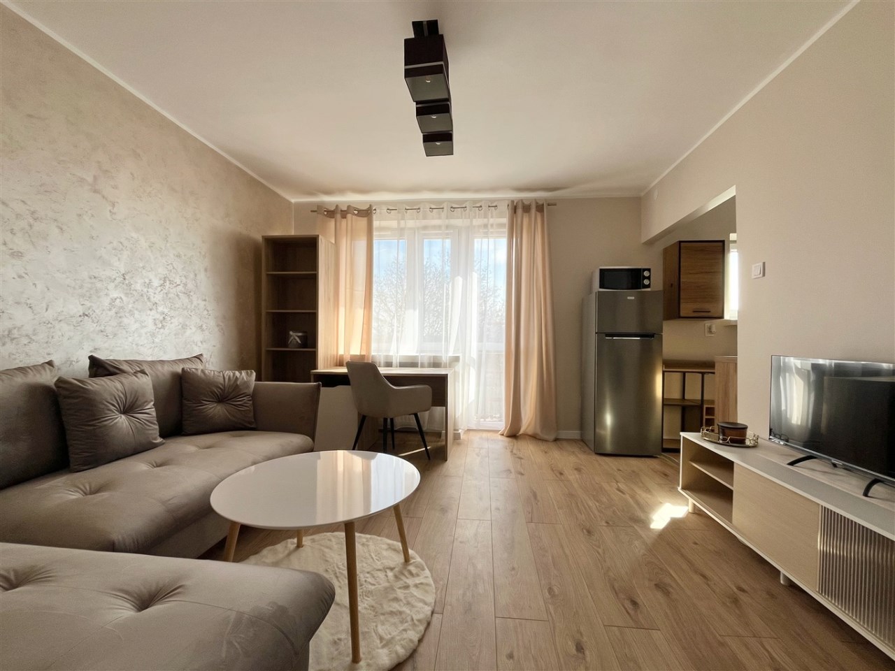 Wyposażenie: meble kuchenne, kuchenka indukcyjna, lodówka, pralka, narożnik rozkładany, biurko, szafa, komoda, stolik.