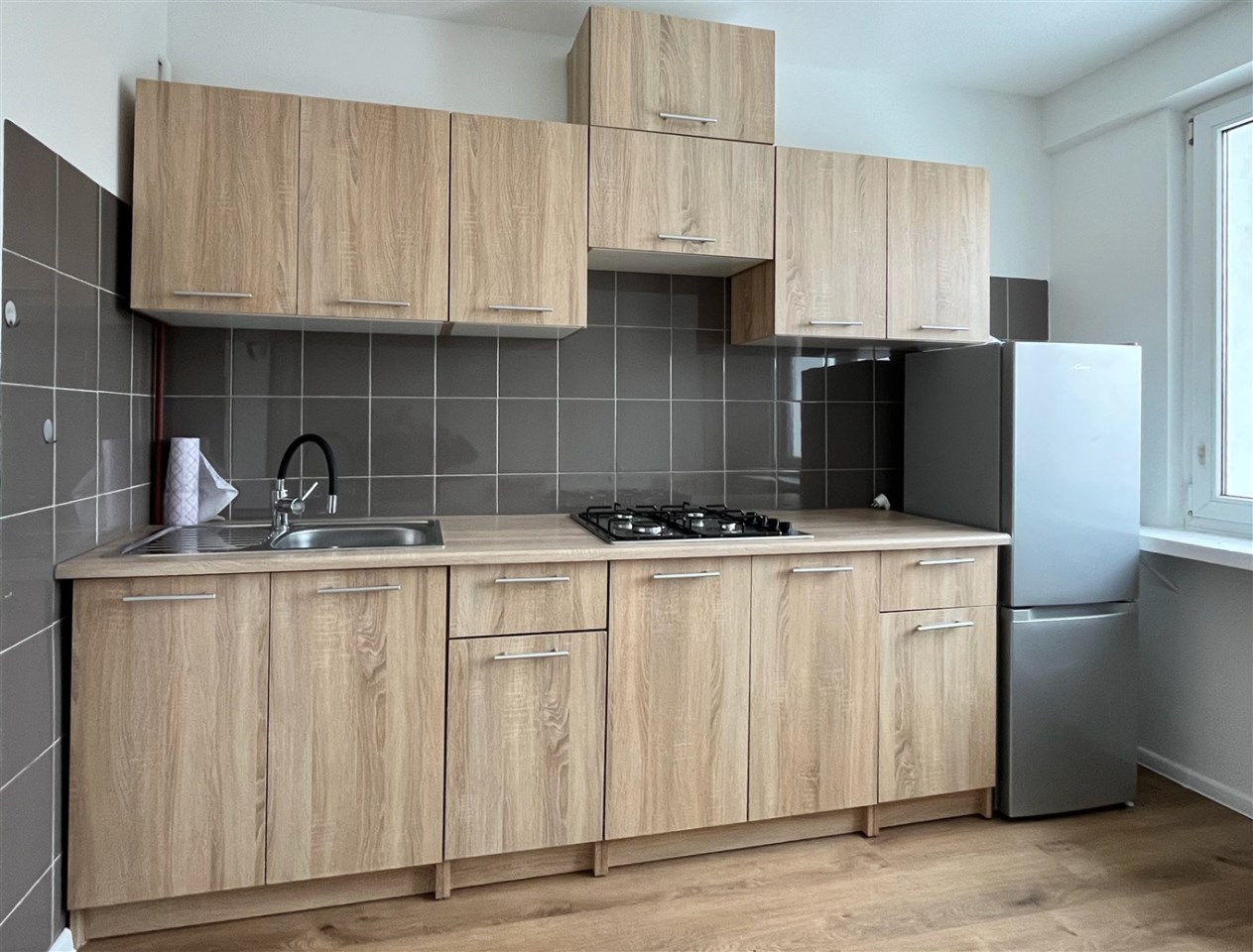 Wyposażenie to między innymi: meble kuchenne z płytą gazową, lodówka z zamrażalnikiem, stół z krzesłami, rozkładana sofa, duża szafa, stolik, pralka.