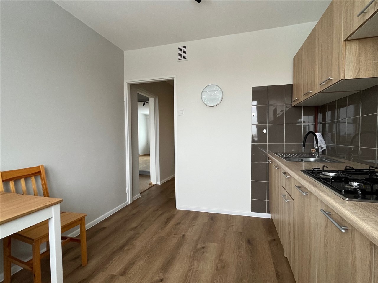 Atutem mieszkania jest duża kuchnia (3 x 2,7 m). Pokój ma wymiary 5,5 x 3,4 m.