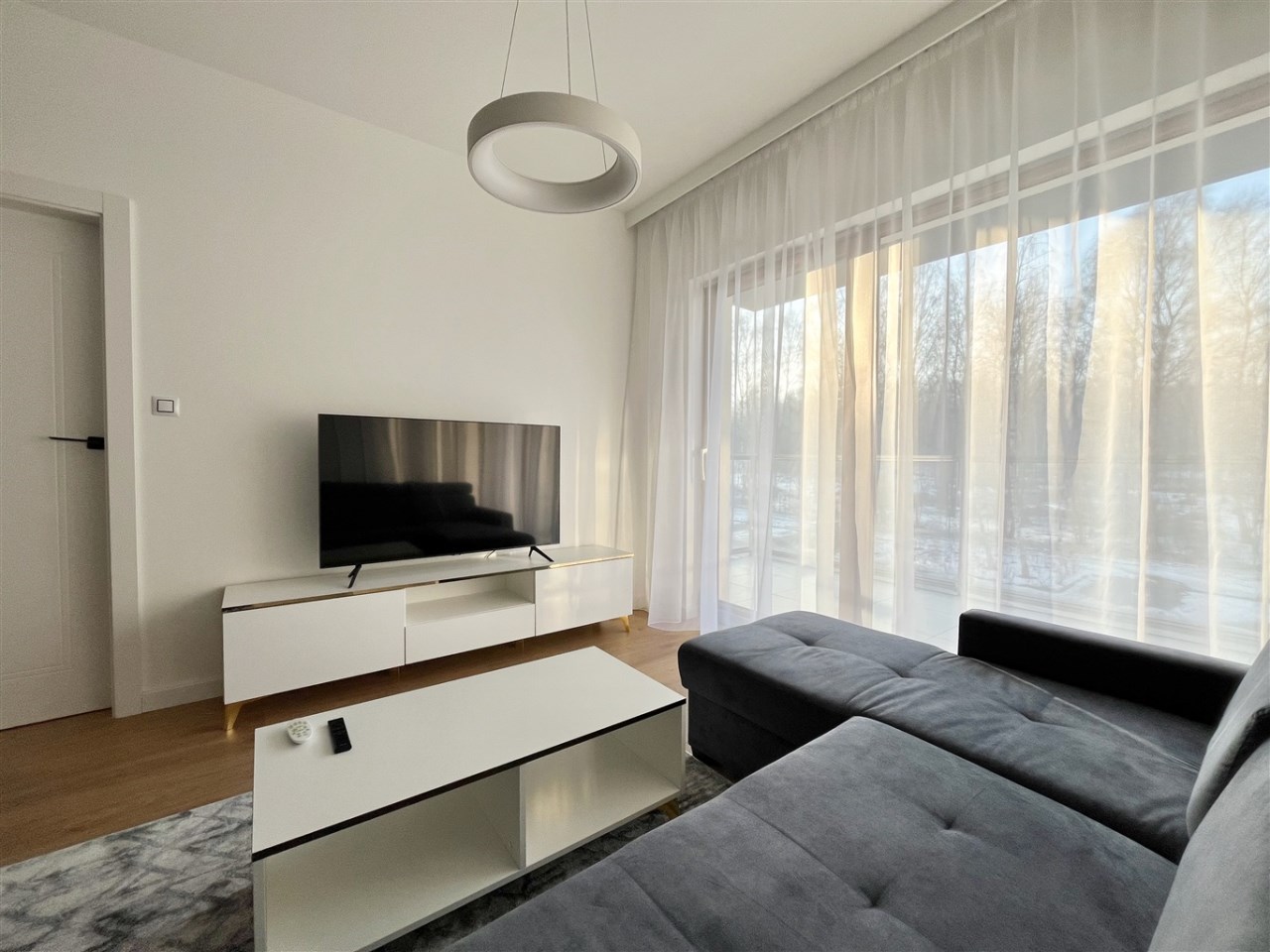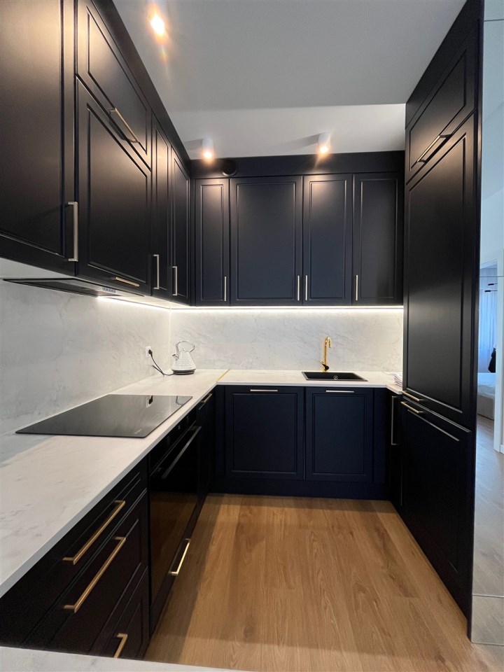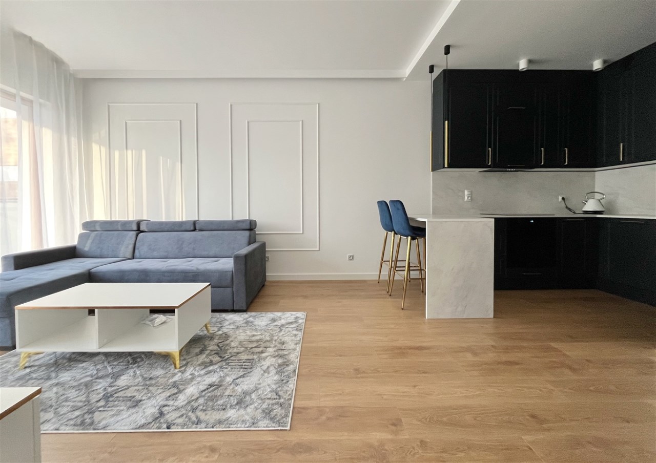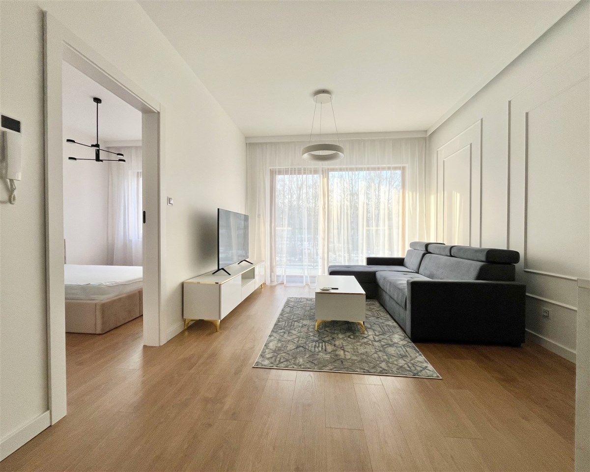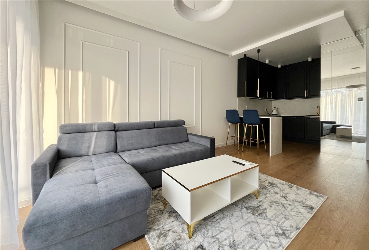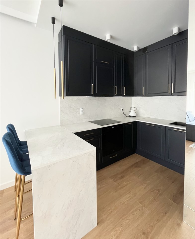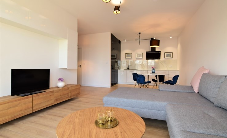 Wysoki standard wykończenia. Zabudowa kuchenna ze zmywarką, płytą indukcyjną, piekarnikiem, lodówką i wyciągiem kuchennym. W salonie komplet wypoczynkowy, stolik, telewizor. W sypialni wygodne łóżko, zabudowane szafy na całej ścianie. W przedpokoju również szafa. Duża łazienka z wygodnym prysznicem, wyposażona min. w pralkę. Ogrzewanie podłogowe, sterowniki w każdym pokoju.