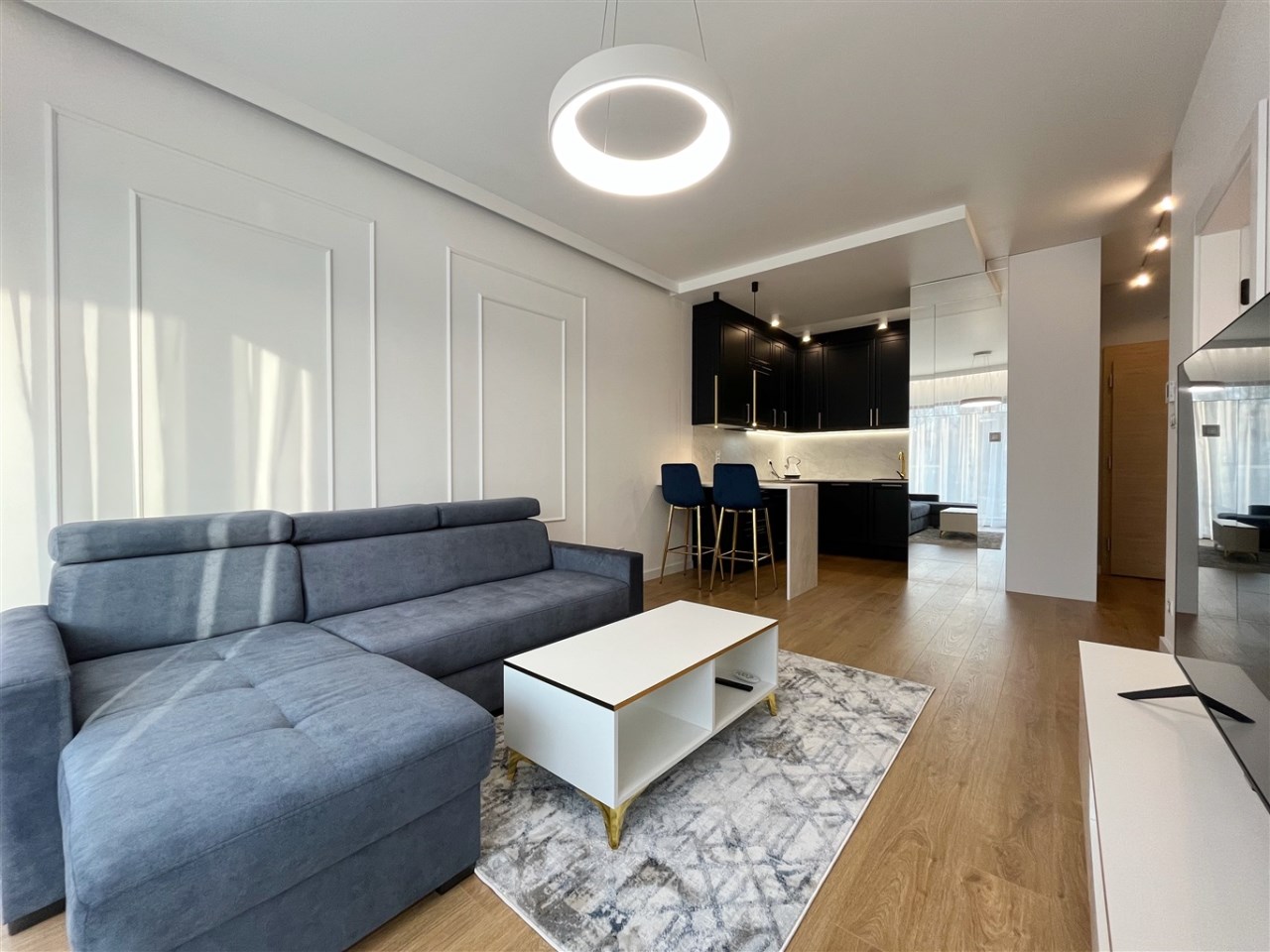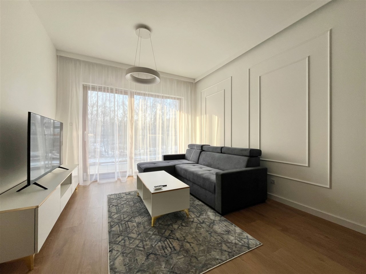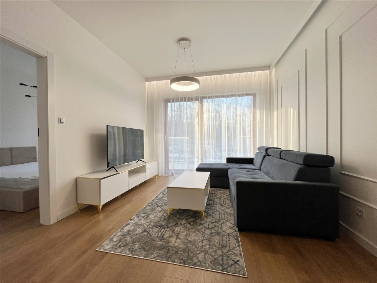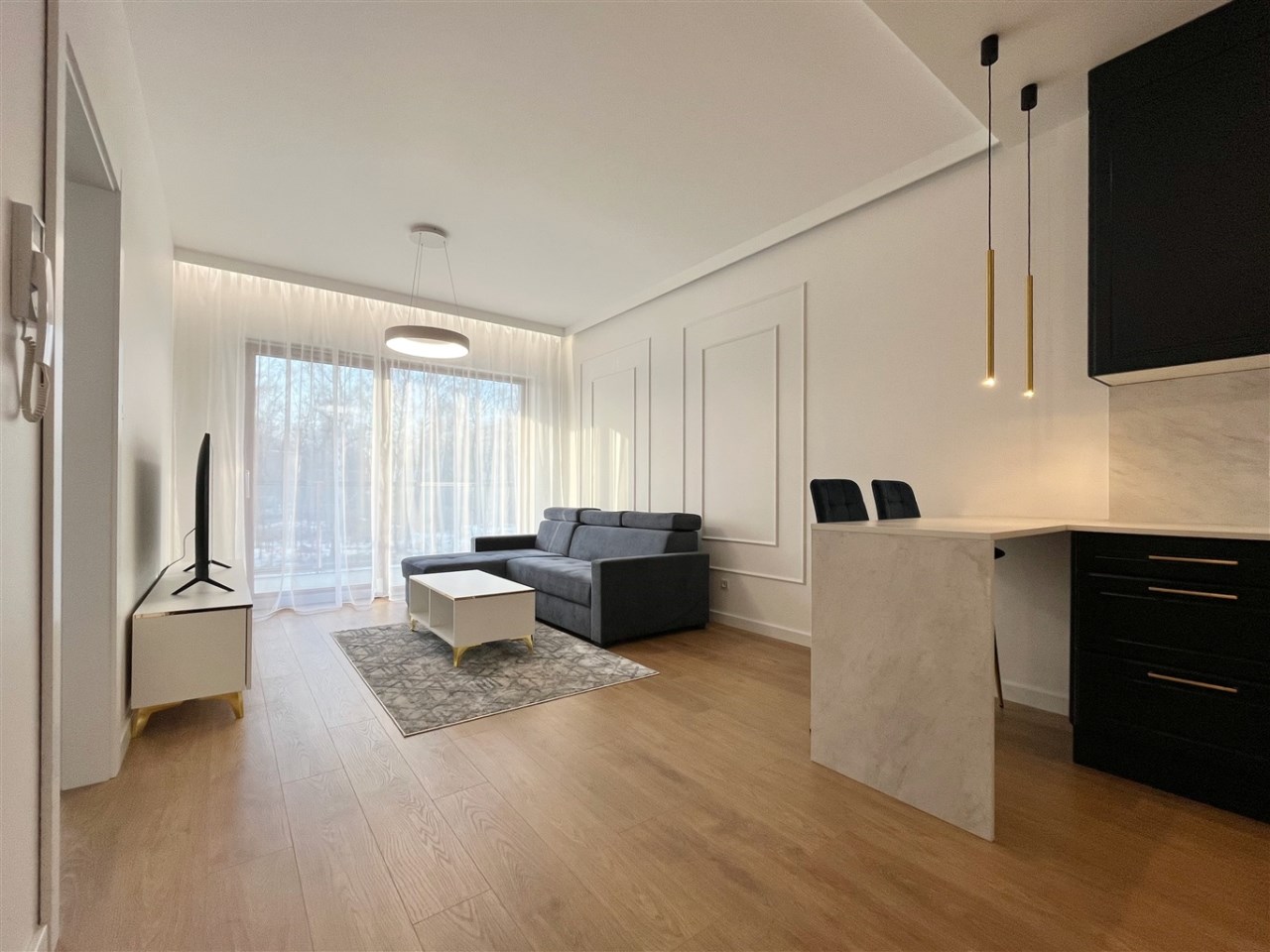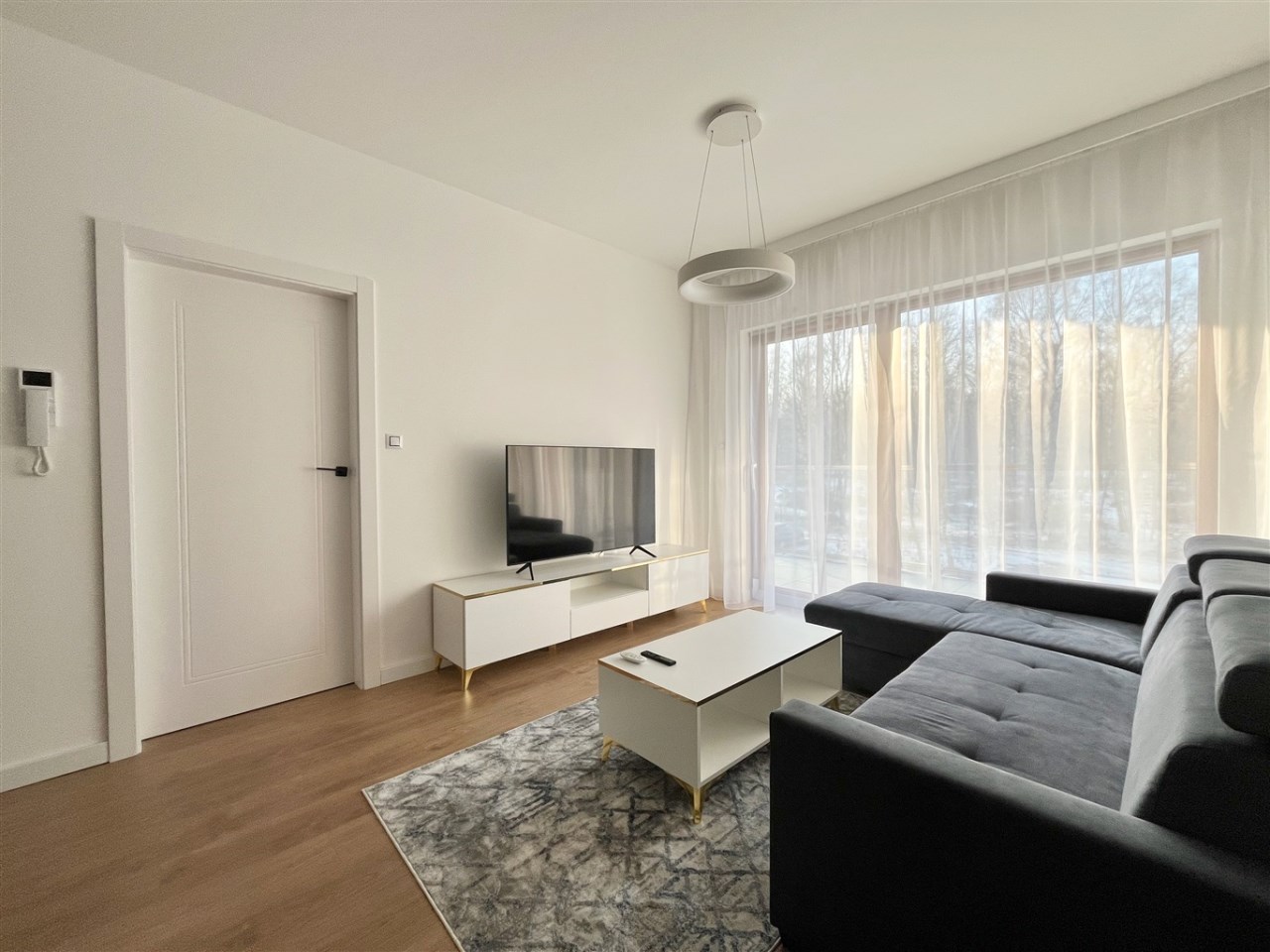 Wysoki standard wykończenia. Zabudowa kuchenna ze zmywarką, płytą indukcyjną, piekarnikiem, lodówką i wyciągiem kuchennym. W salonie komplet wypoczynkowy, stolik, telewizor. W sypialni wygodne łóżko, zabudowane szafy na całej ścianie. W przedpokoju również szafa. Duża łazienka z wygodnym prysznicem, wyposażona min. w pralkę. Ogrzewanie podłogowe, sterowniki w każdym pokoju.